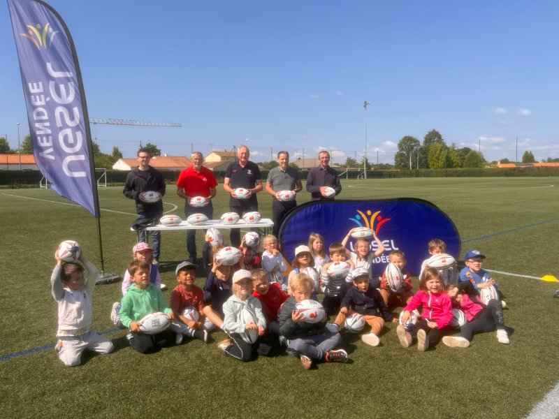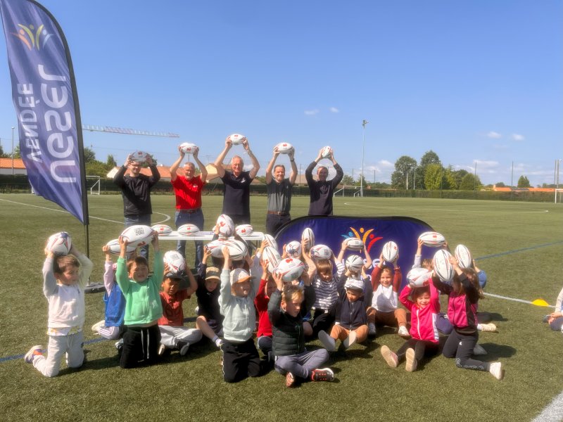 Jeudi 22 mai 2025, l’UGSEL Vendée et le Comité Départemental de Vendée de rugby ont renouvelé leur partenariat. Ce fut l’occasion, pour les enfants de cycle 1, de vivre une matinée d’activité autour de la balle ovale sur le terrain synthétique du complexe sportif de Mouilleron le Captif : un moment de partage et de sport qui ponctue le projet des enseignantes, investies dans l’activité baby rugby avec leurs élèves de maternelle.